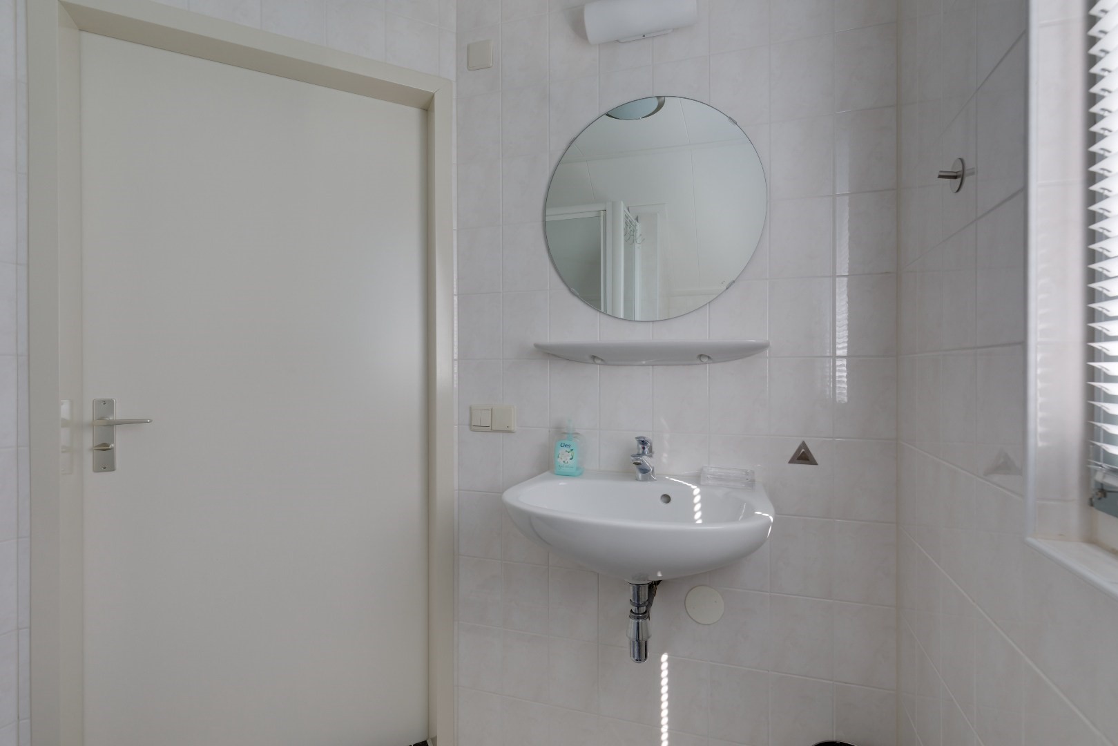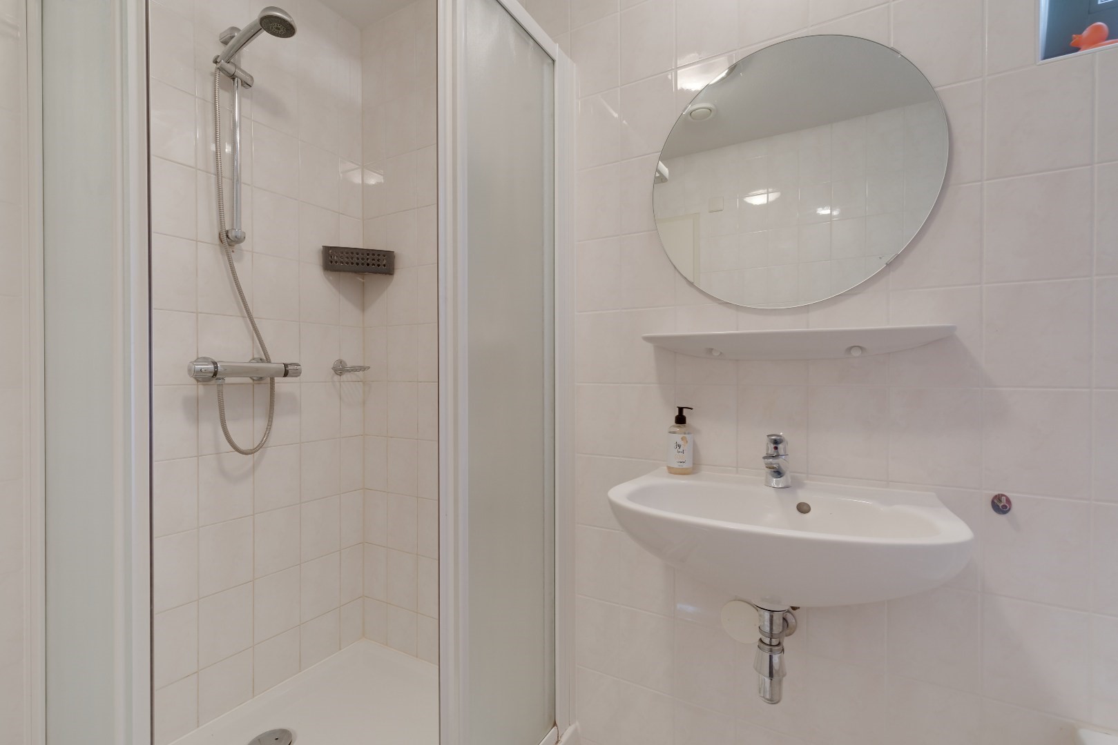 De (gasten-)badkamer op de verdieping is voorzien van een douche met cabine, wastafel, hangtoilet en radiator.