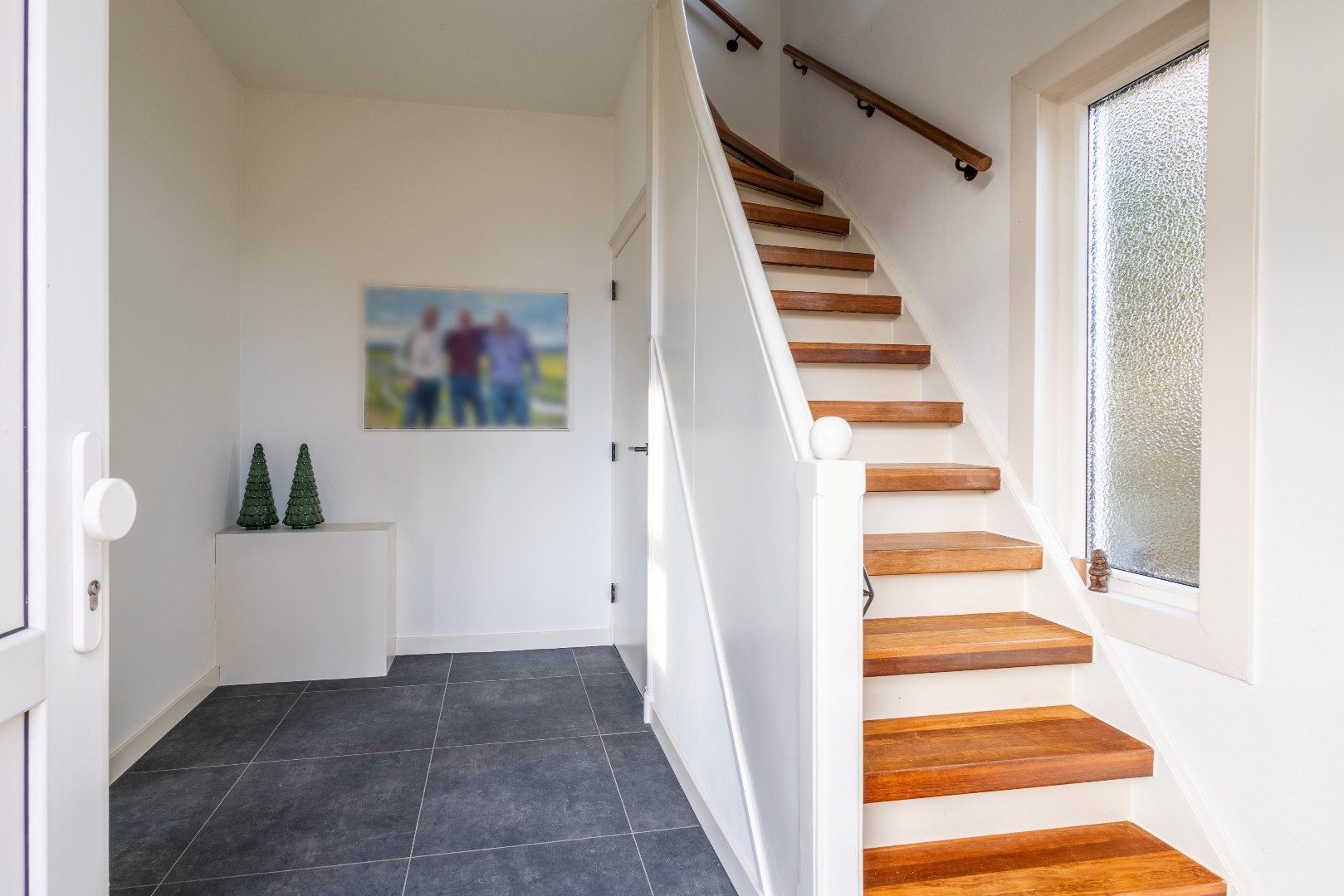 Begane grond: entrée/hal met trapopgang naar de verdieping; lichte en ruime woonkamer voorzien van plavuizenvloer met vloerverwarming en openslaande deuren naar het overdekte terras; open keuken voorzien van luxe en handgemaakte inbouwkeuken; bijkeuken met moderne toiletruimte, meterkast en achteringang.