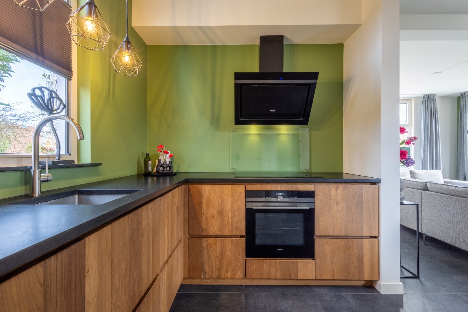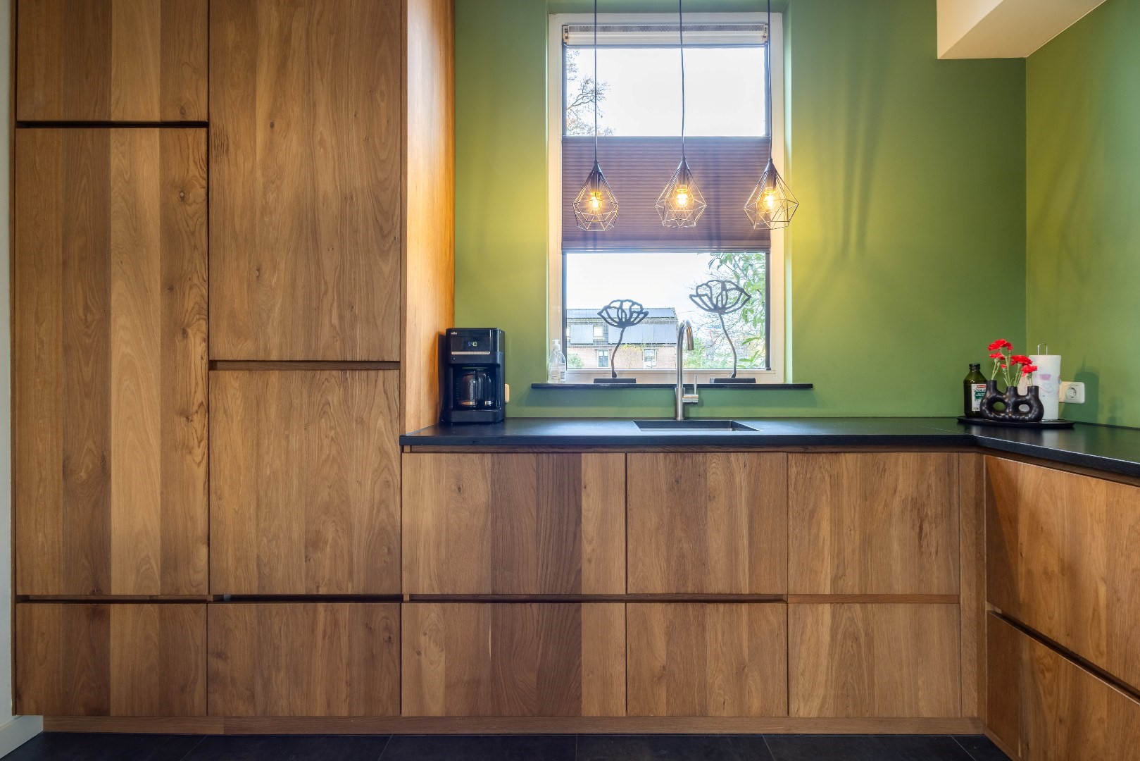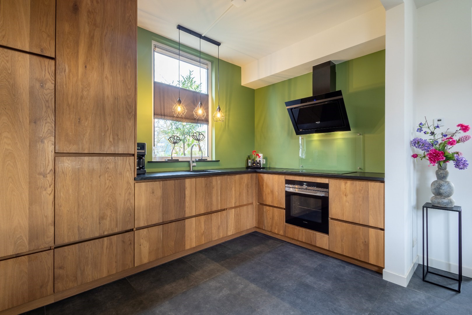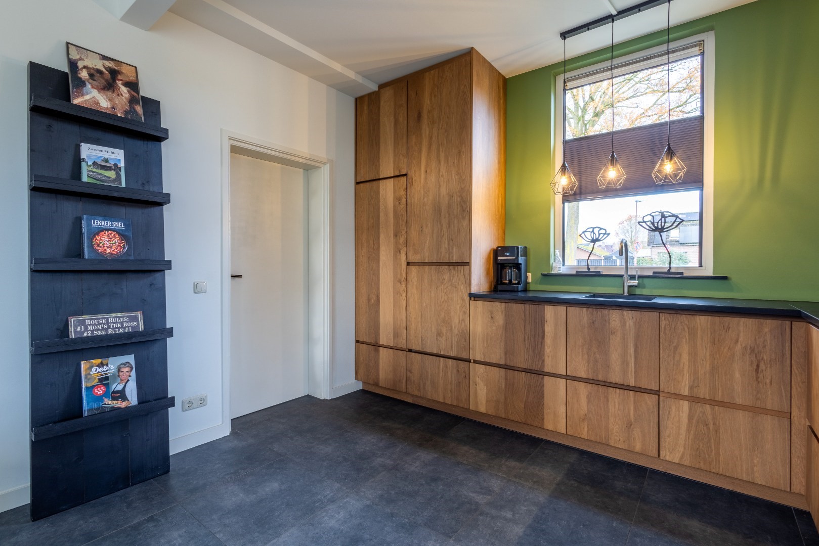De open keuken is voorzien van een luxe handgemaakte inbouwkeuken (2022, door keukenmaker Klaas Olthoff) met daarin een inductiekookplaat, afzuigkap, koelkast, vrieskast, vaatwasser en oven.