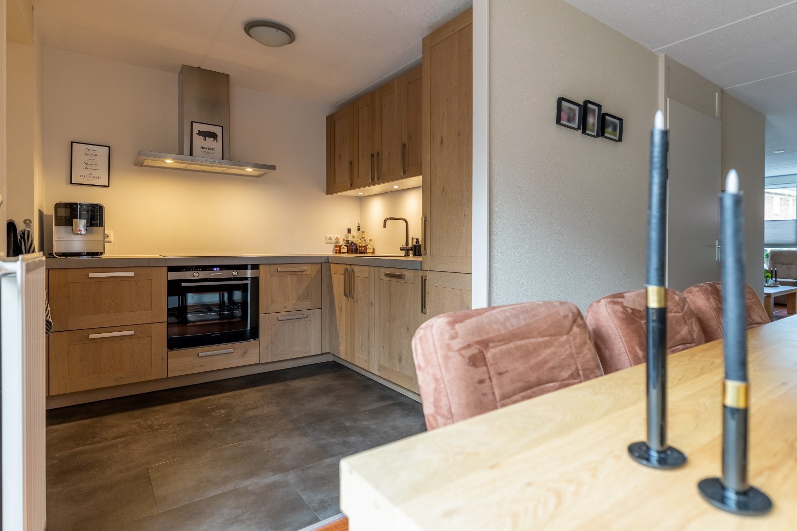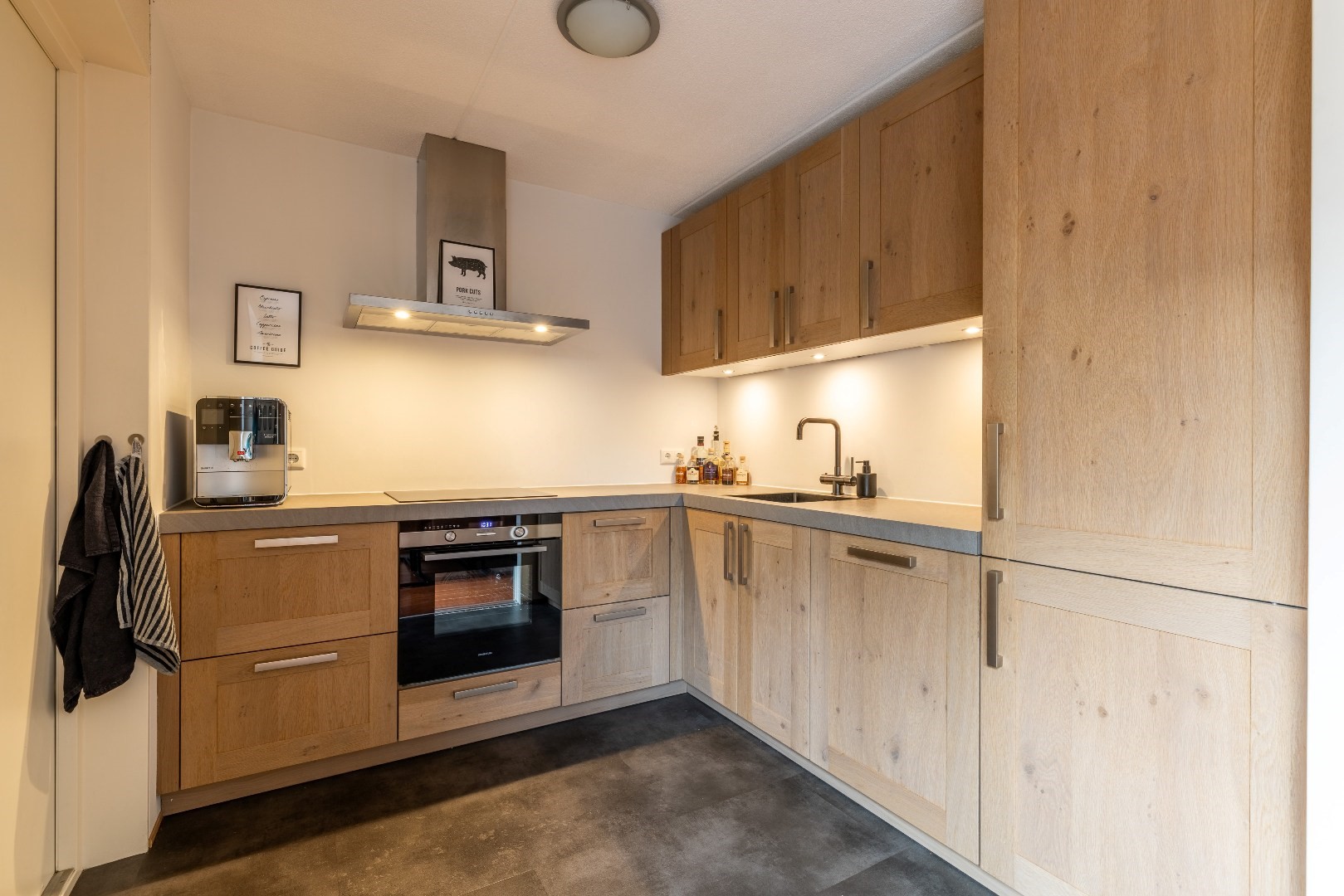 De open keuken is voorzien van een moderne en luxe hoekopgestelde inbouwkeuken (2019) met daarin een inductiekookplaat, RVS afzuigkap, koelkast, vaatwasser en oven.