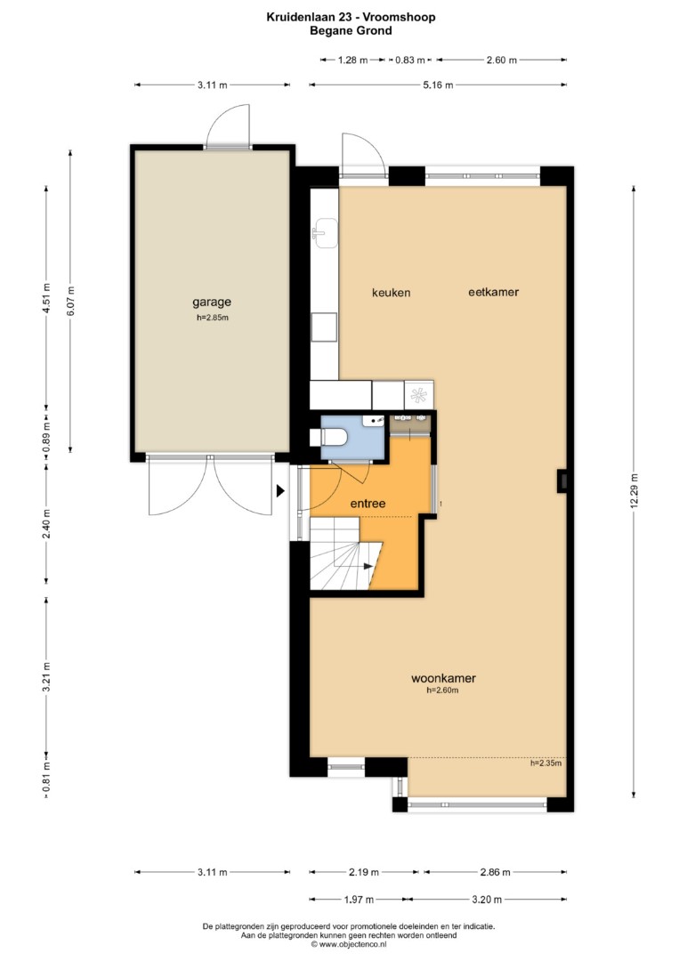 Begane grond: entrée/hal met meterkast, trapopgang naar de 1e verdieping en moderne toiletruimte; lichte en ruime l-vormige woonkamer voorzien van erker en laminaatvloer; open en uitgebouwde woonkeuken met moderne en luxe uitgevoerde inbouwkeuken; vanuit de keuken binnendoor naar de garage/berging.