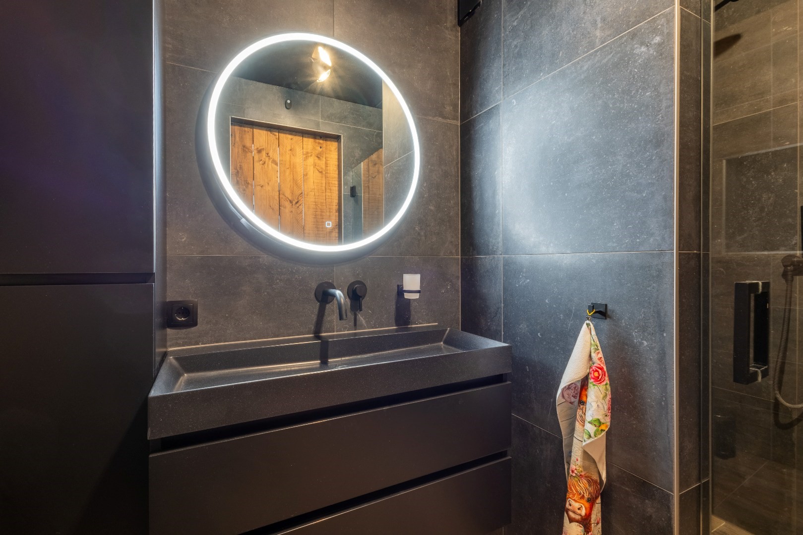 De moderne badkamer (2023) is voorzien van een inloopdouche, wastafelmeubel, hangtoilet en designradiator.