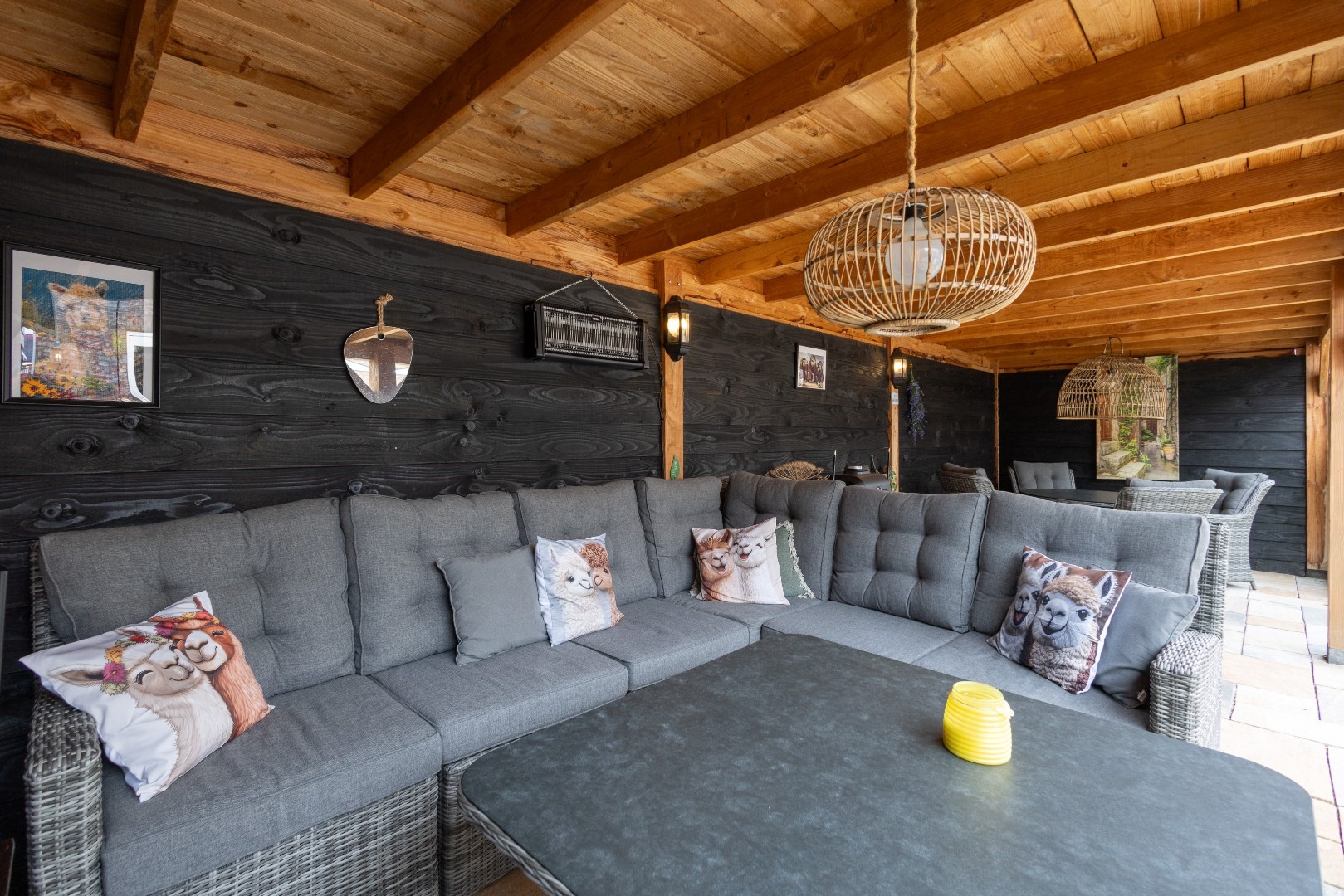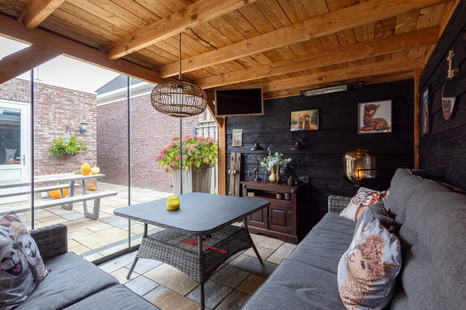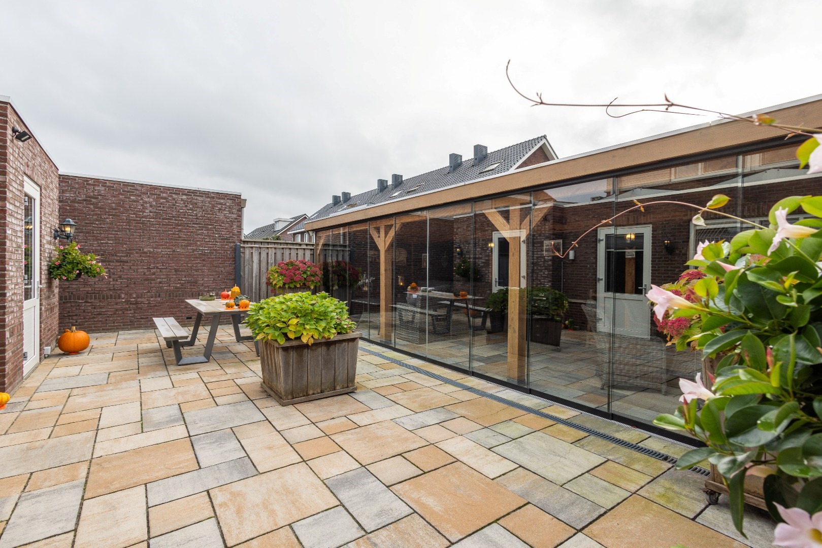 -in 2019 is er een zeer ruime tuinkamer gerealiseerd welke geheel is af te sluiten met glazen schuifwanden