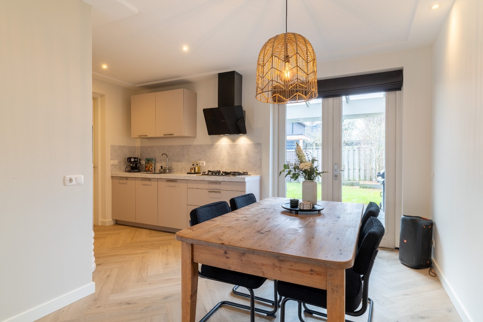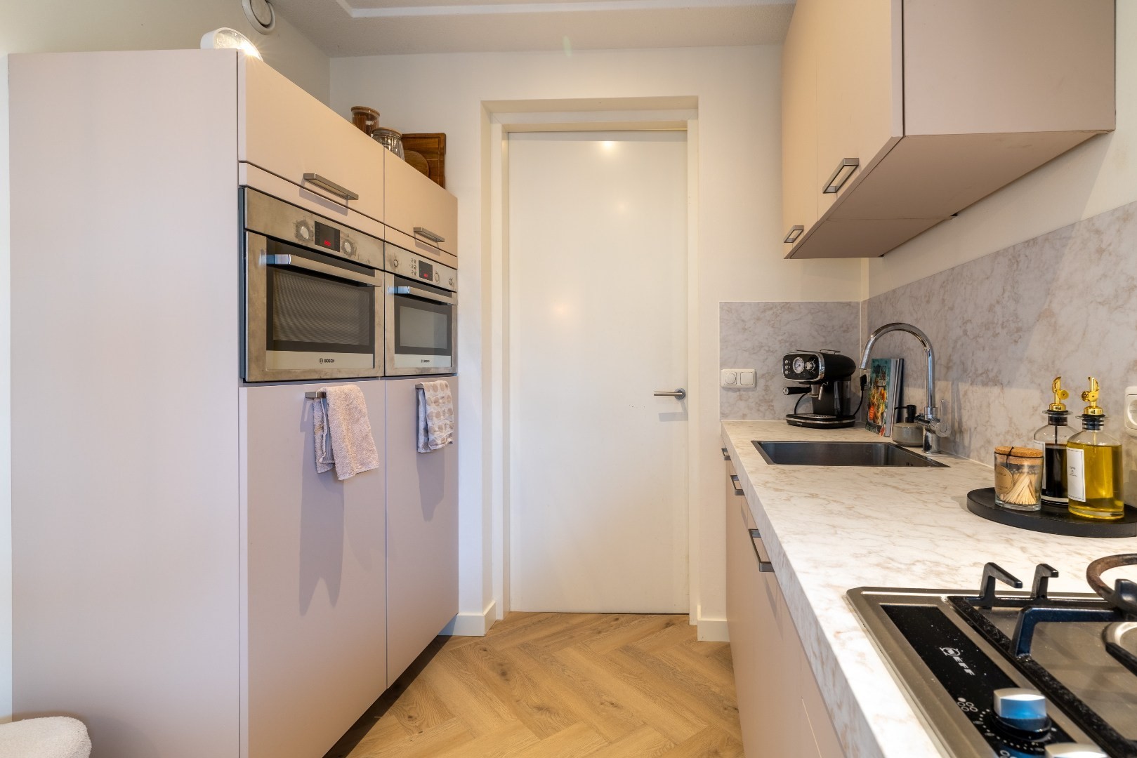 De open keuken is voorzien van een moderne inbouwkeuken (2015) met daarin een gaskookplaat, RVS afzuigkap, koelkast, vrieskast, vaatwasser, oven en magnetron.