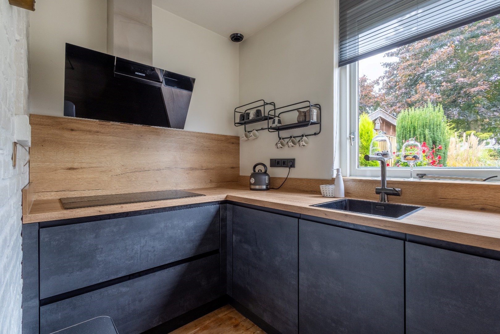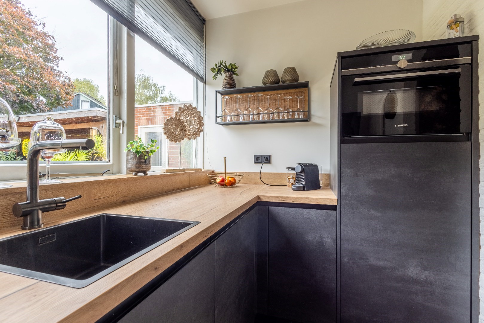 Half open keuken u-vormige en moderne inbouwkeuken (2021) is voorzien van een inductiekookplaat, afzuigkap, koelkast, vaatwasser en magnetron.