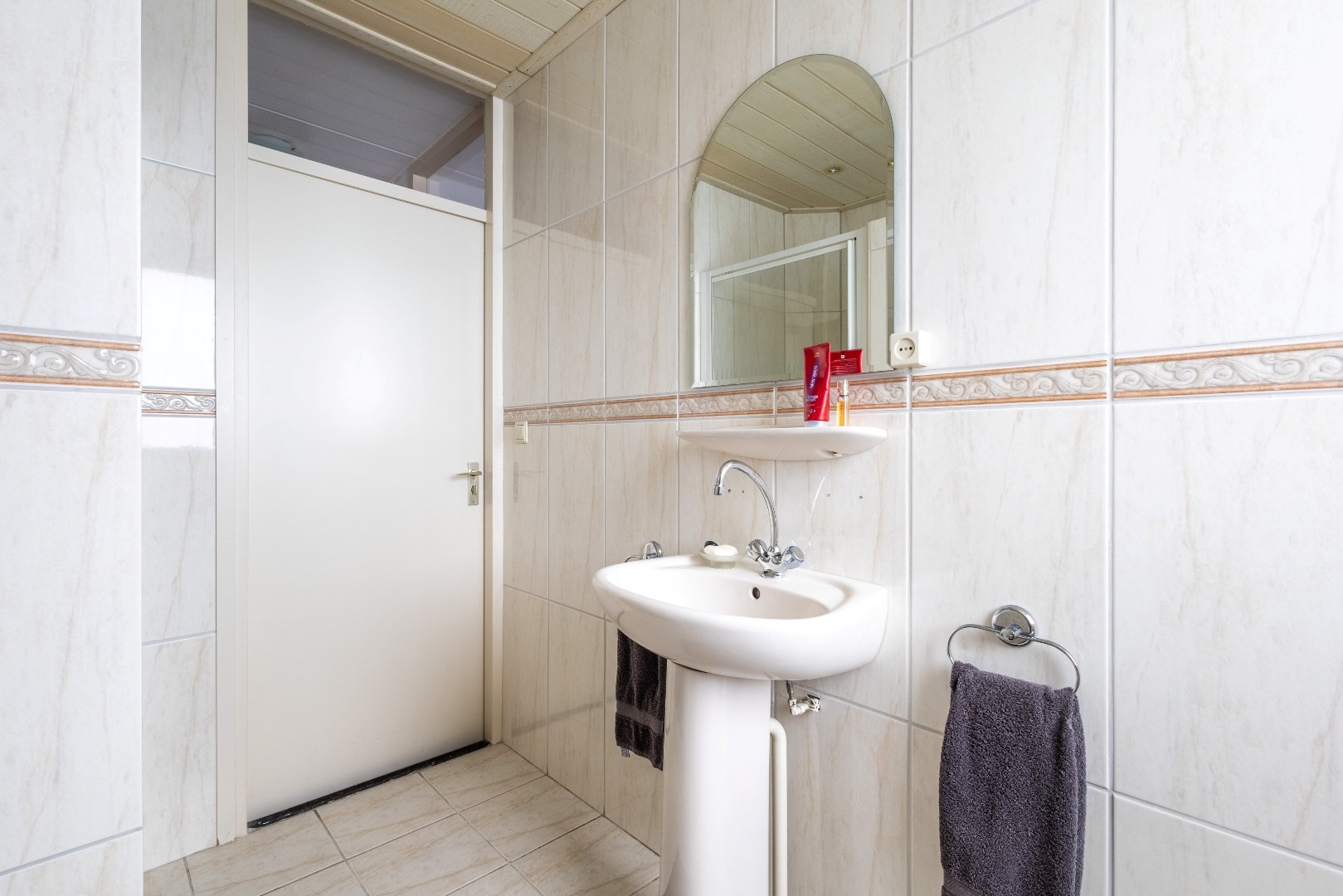 De lichte badkamer is voorzien van een inloopdouche met glasdeur, wastafel, toilet en radiator.