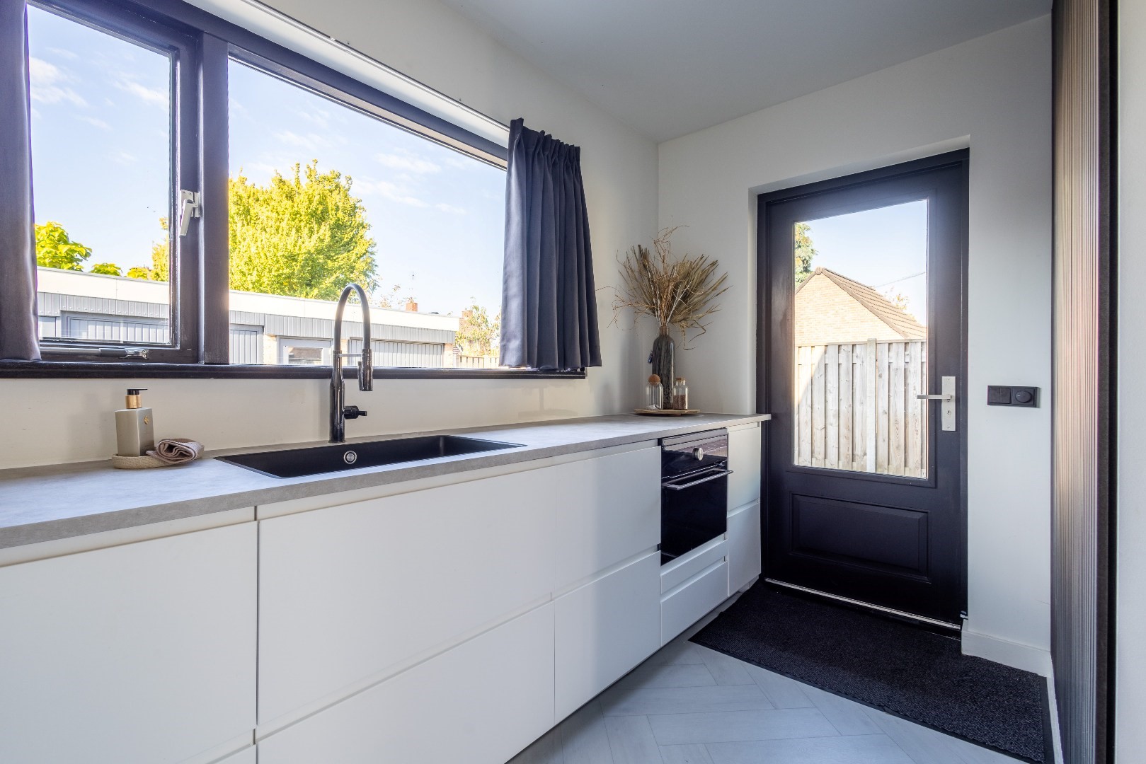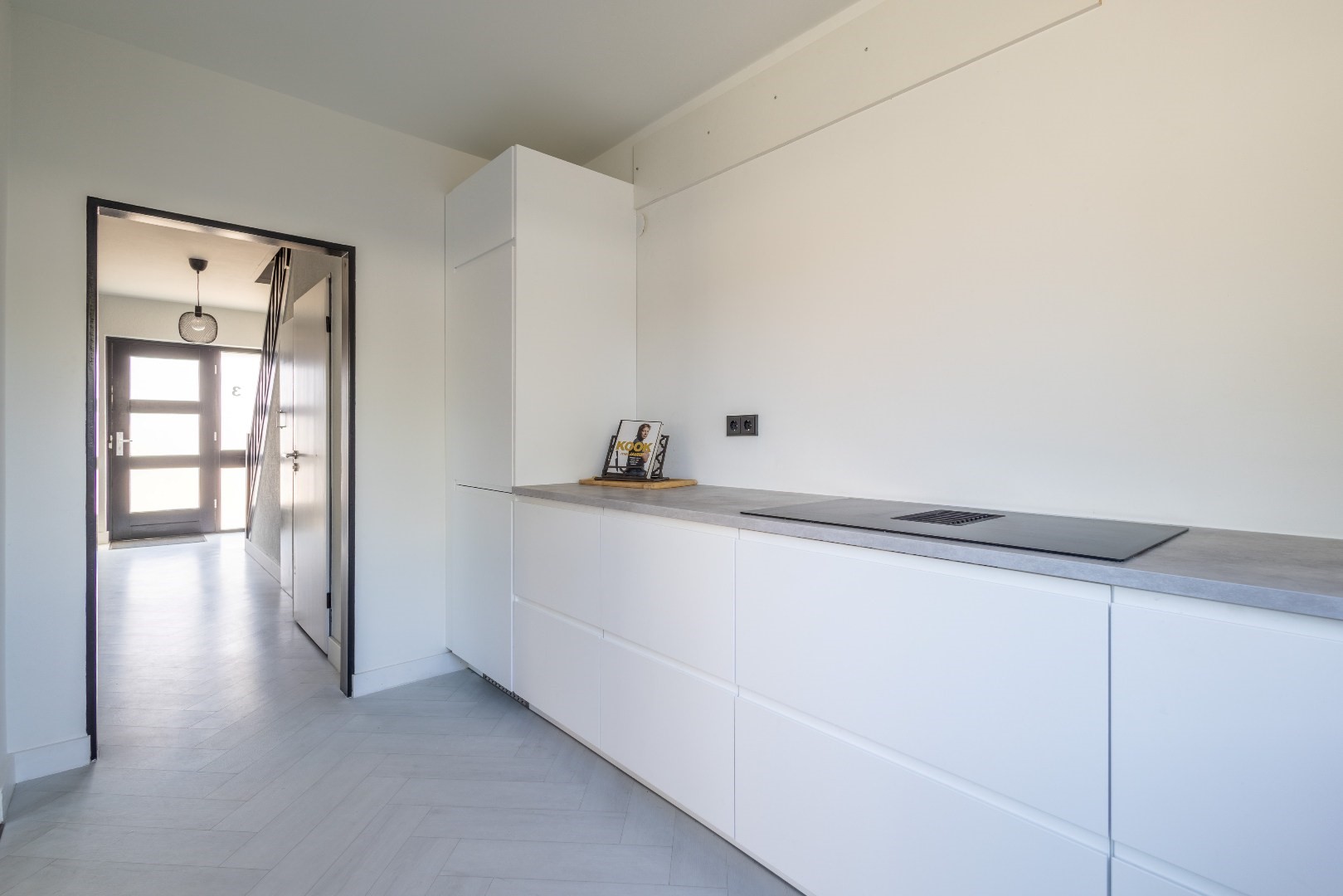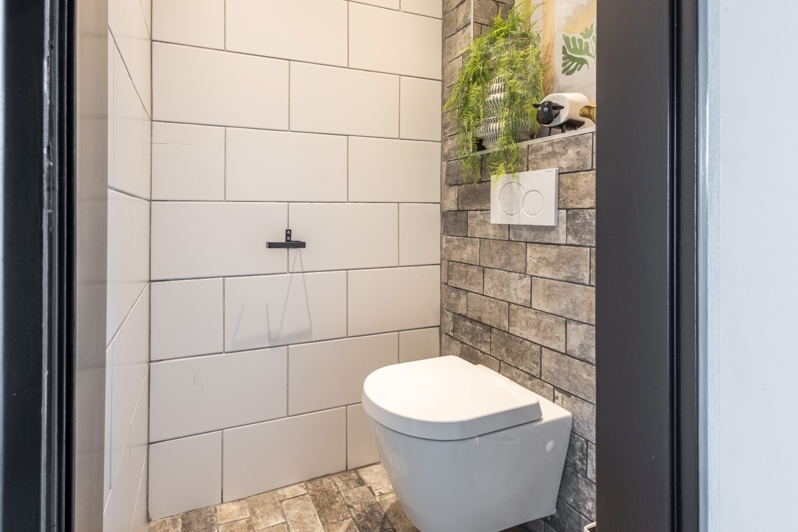 1e verdieping en moderne toiletruimte; lichte en modern afgewerkte doorzon-woonkamer, voorzien van PVC-vloer; half-open keuken voorzien van achteringang en modern hoekopstelde inbouwkeuken.