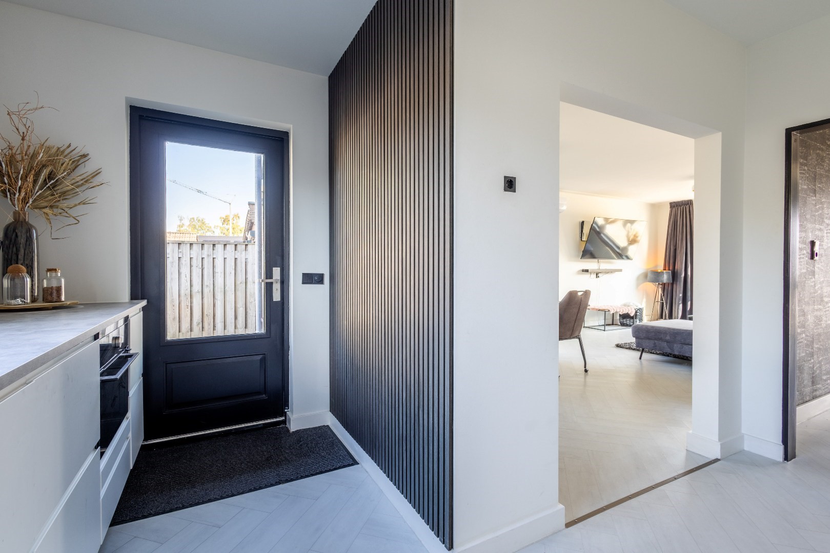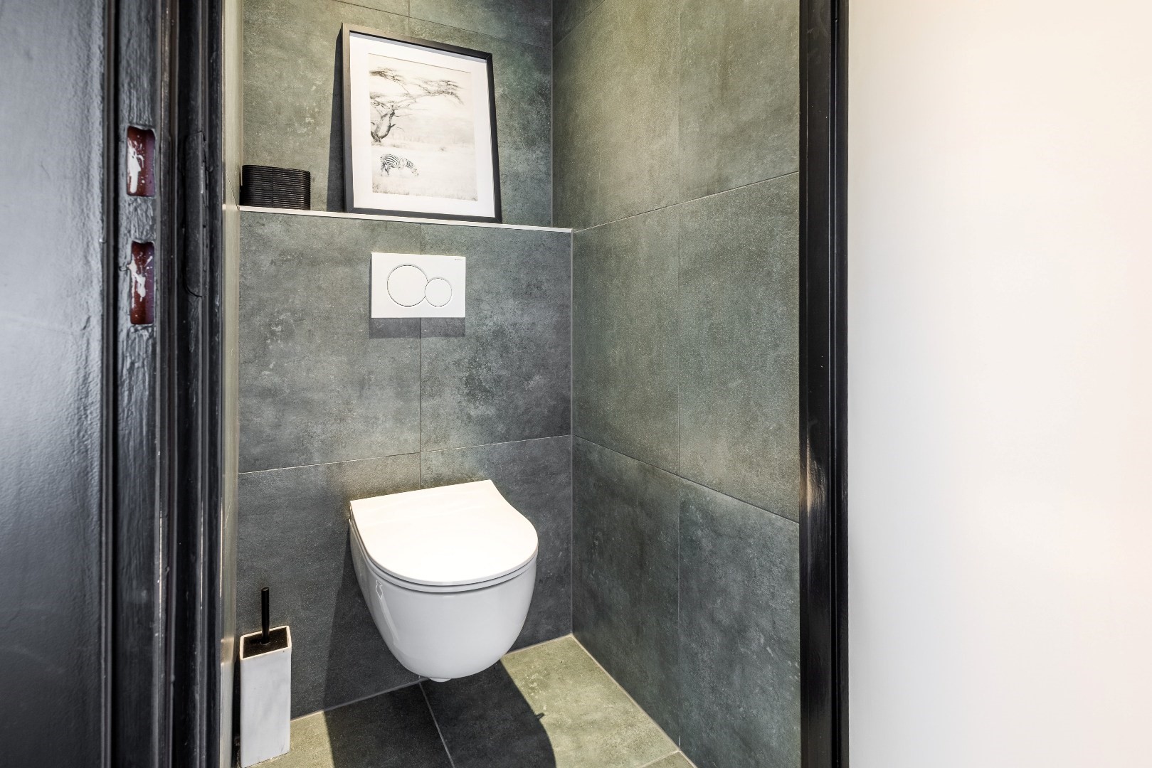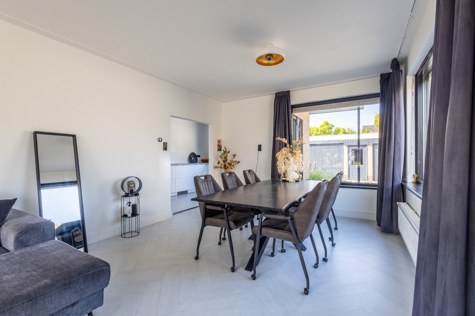 1e verdieping en moderne toiletruimte; lichte en modern afgewerkte doorzon-woonkamer, voorzien van PVC-vloer; half-open keuken voorzien van achteringang en modern hoekopstelde inbouwkeuken.