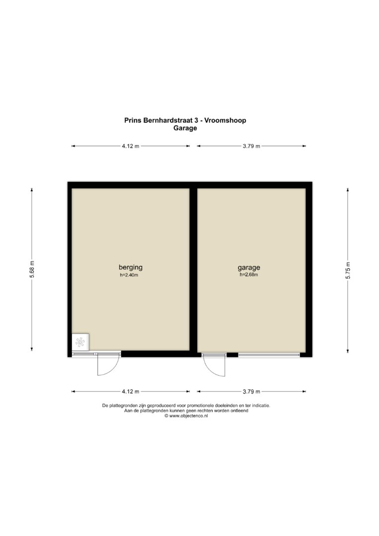 Twee ruime geschakelde garages (afmeting: linker is 4,12 x 5,75 meter en de rechter 3,79 x 5,75 meter). Van de linker garage zijn de muren van binnenuit na-geïsoleerd .