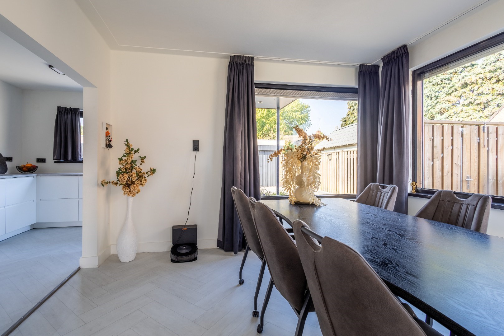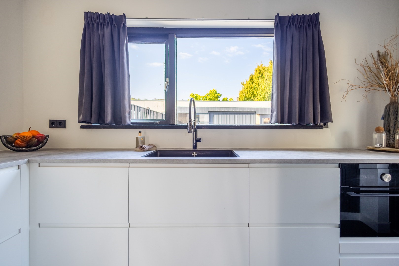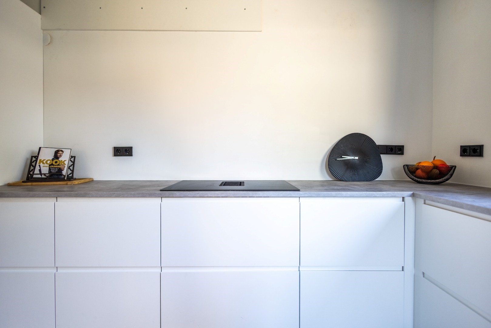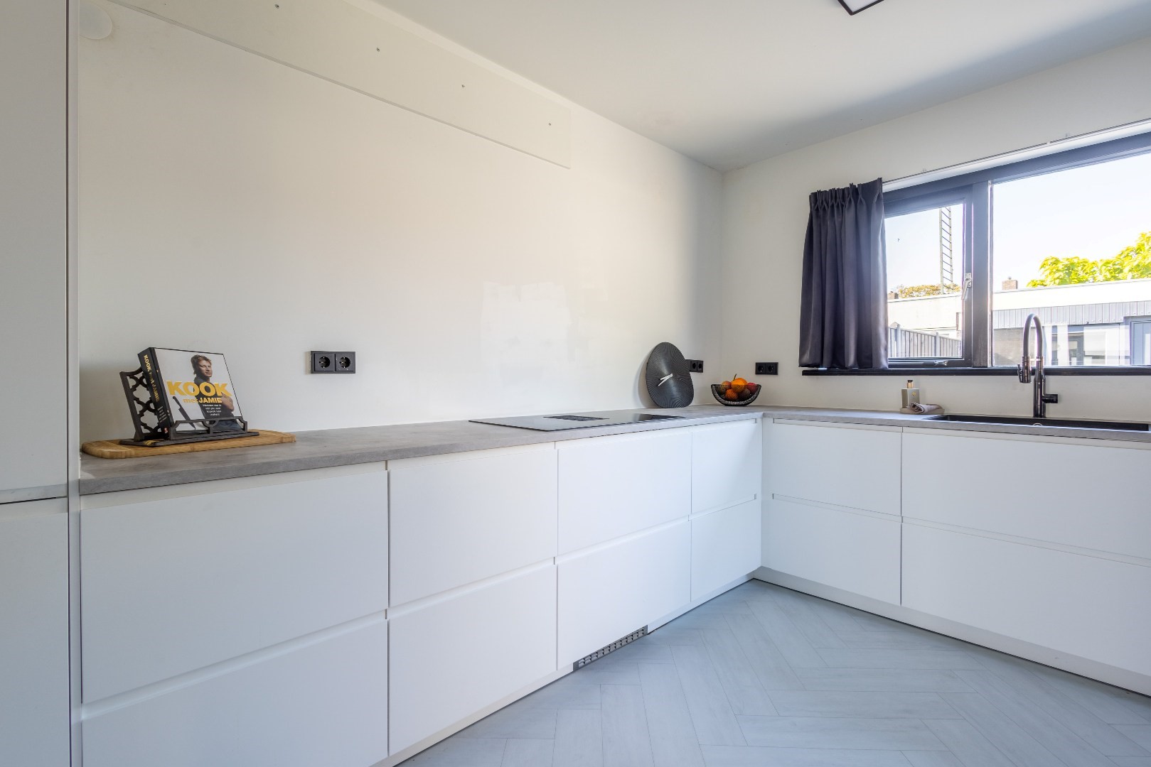 De half open keuken is voorzien van een moderne hoekopgestelde inbouwkeuken (2023) met daarin een inductiekookplaat met geïntegreerd afzuigsysteem, koelkast, vrieskast, vaatwasser en combi-magnetron.
