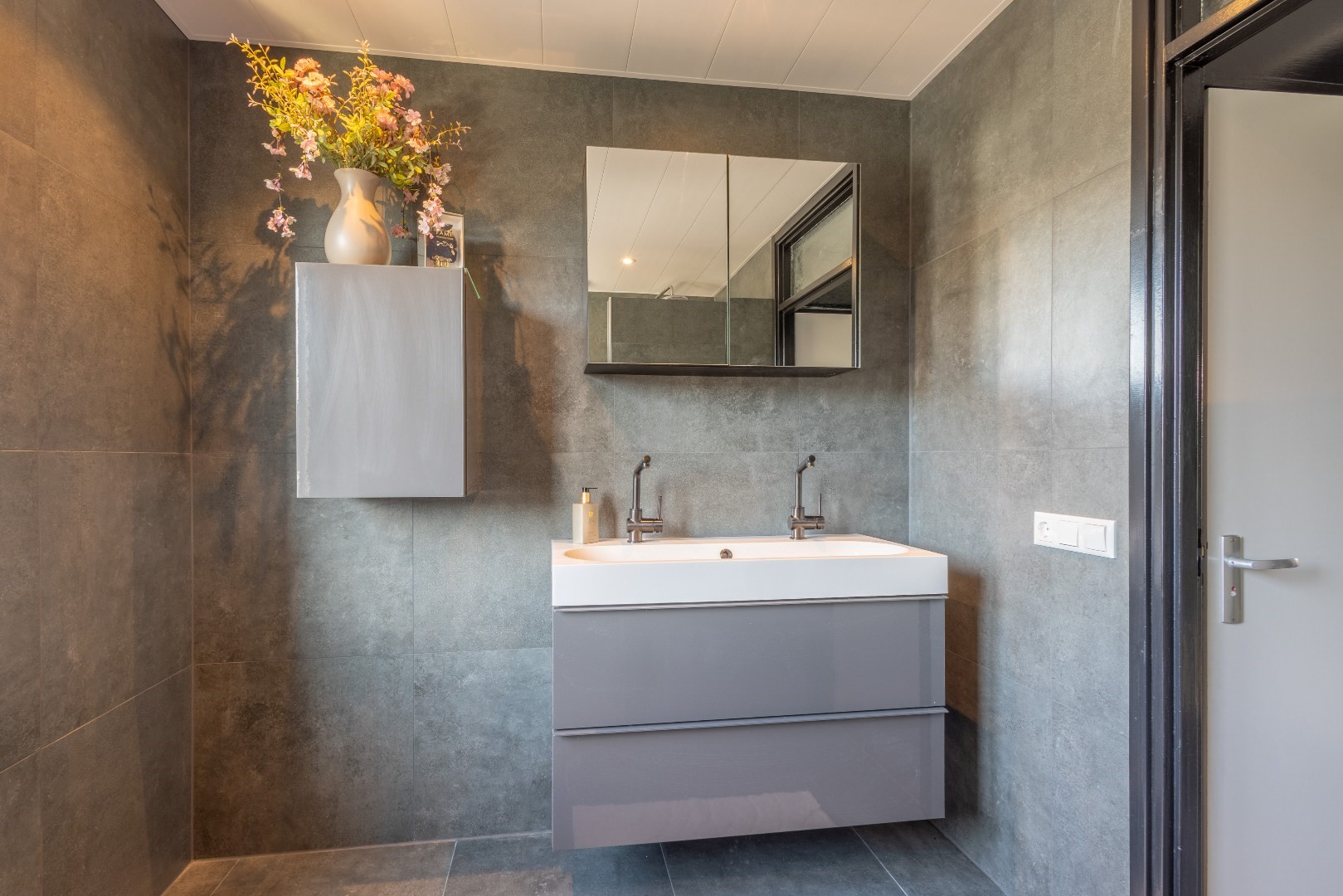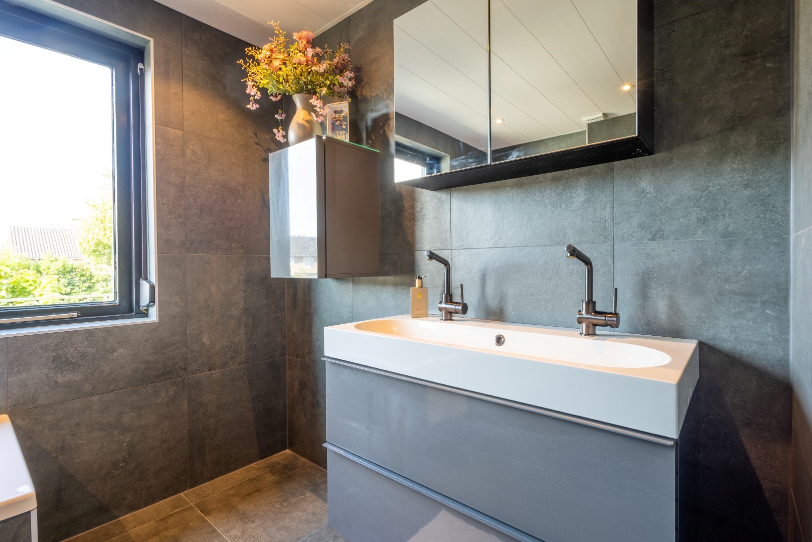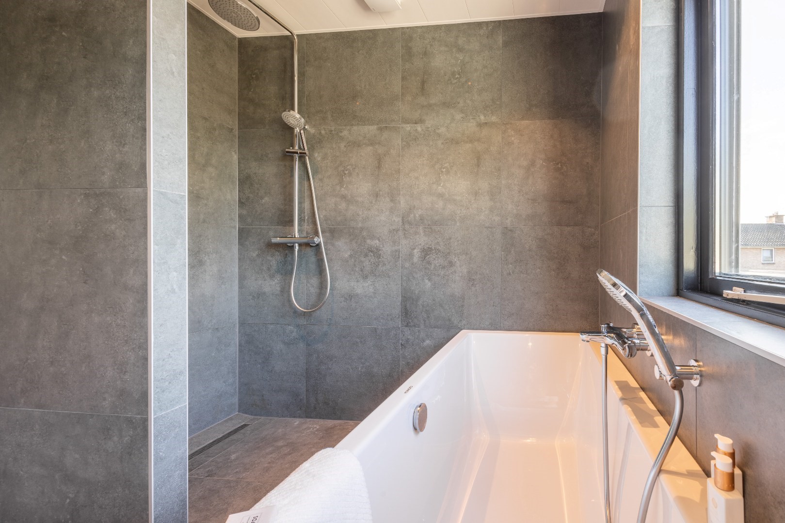 De moderne badkamer (2023) is voorzien van een inloopdouche, ligbad, wastafelmeubel en vloerverwarming.