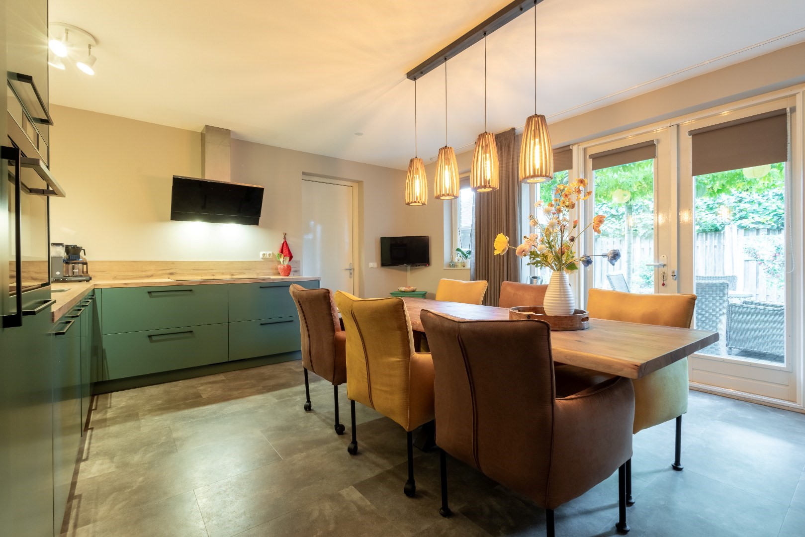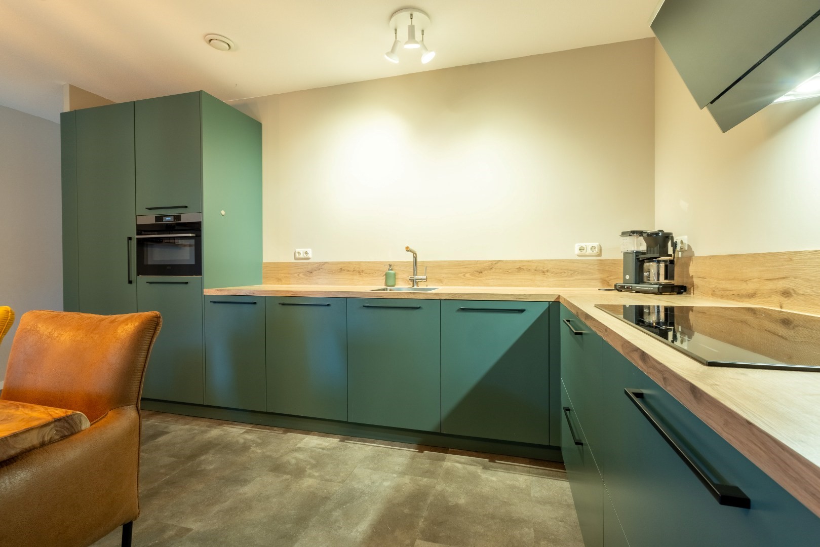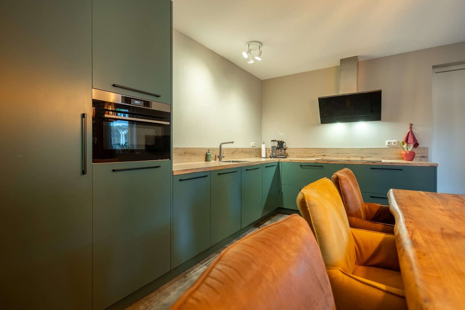 De riante en uitgebouwde woonkeuken is voorzien van een moderne inbouwkeuken (2023) met daarin een inductiekookplaat, afzuigkap, koelkast, vaatwasser en elektrische oven.