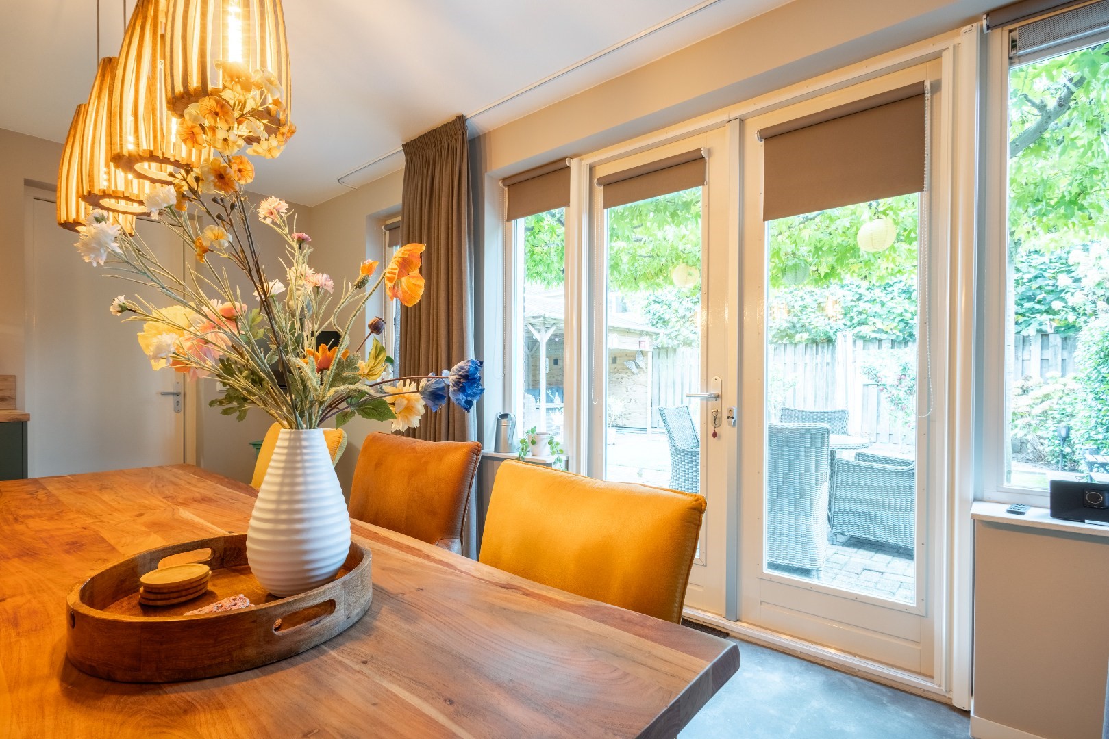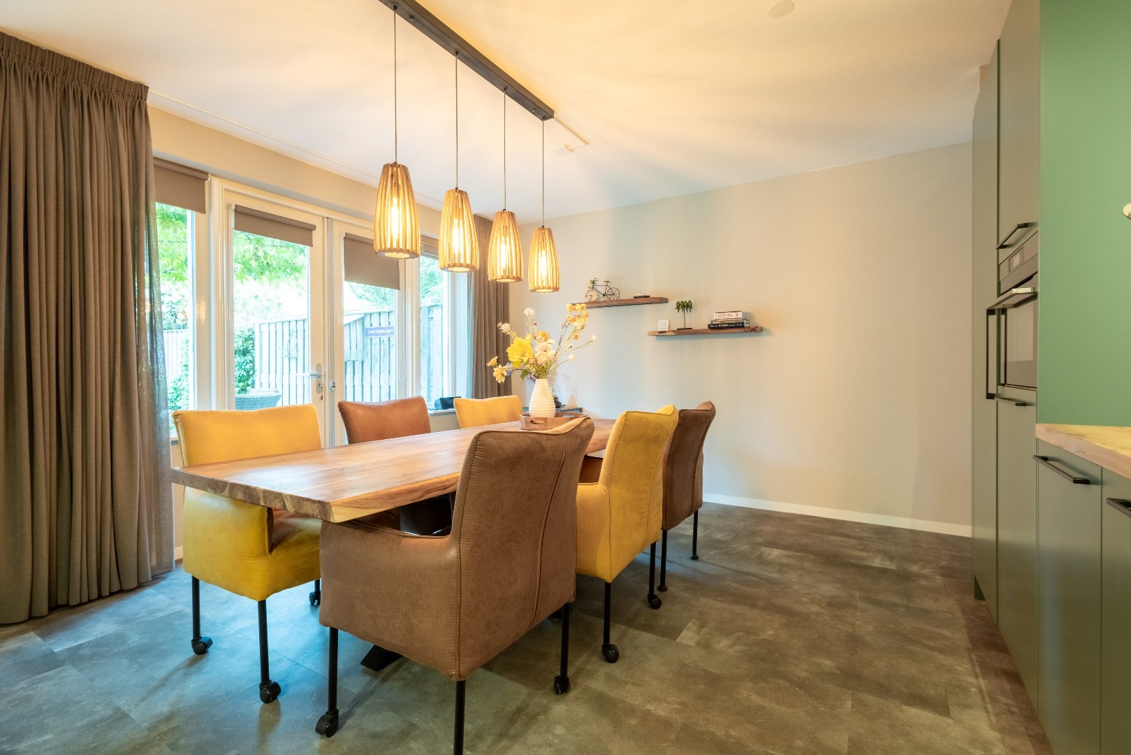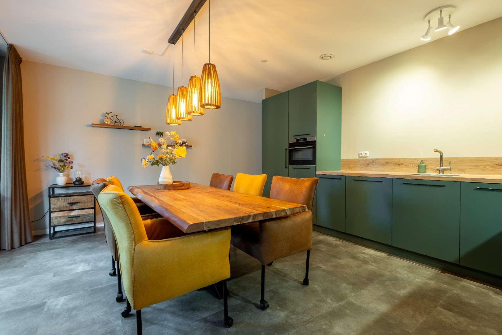 De riante en uitgebouwde woonkeuken is voorzien van een moderne inbouwkeuken (2023) met daarin een inductiekookplaat, afzuigkap, koelkast, vaatwasser en elektrische oven.