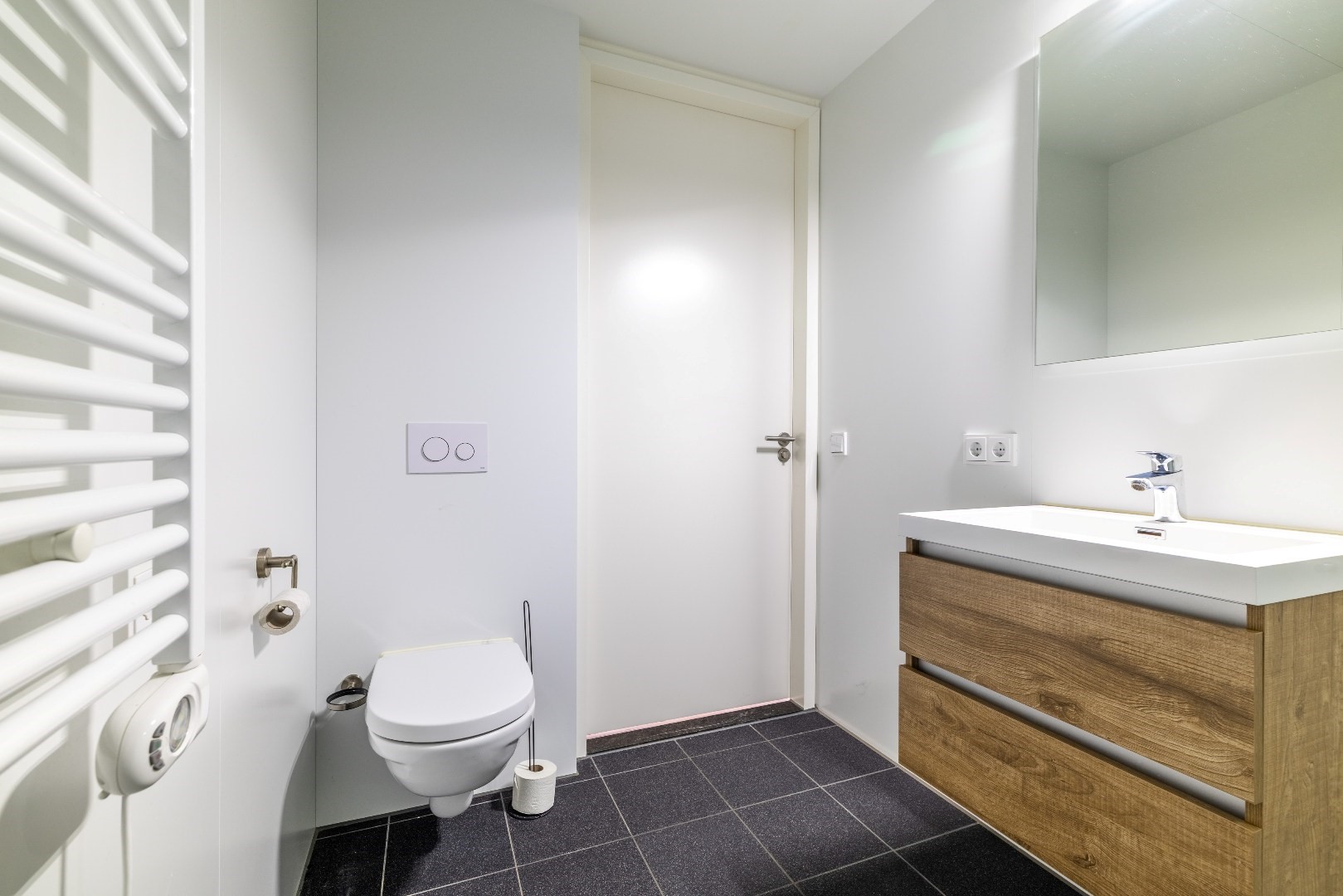 Begane grond: entrée/hal met meterkast, moderne toiletruimte en trapopgang naar de 1e verdieping; L-vormige woonkamer voorzien van een vaste kast en deur naar het terras; luxe inbouwkeuken.